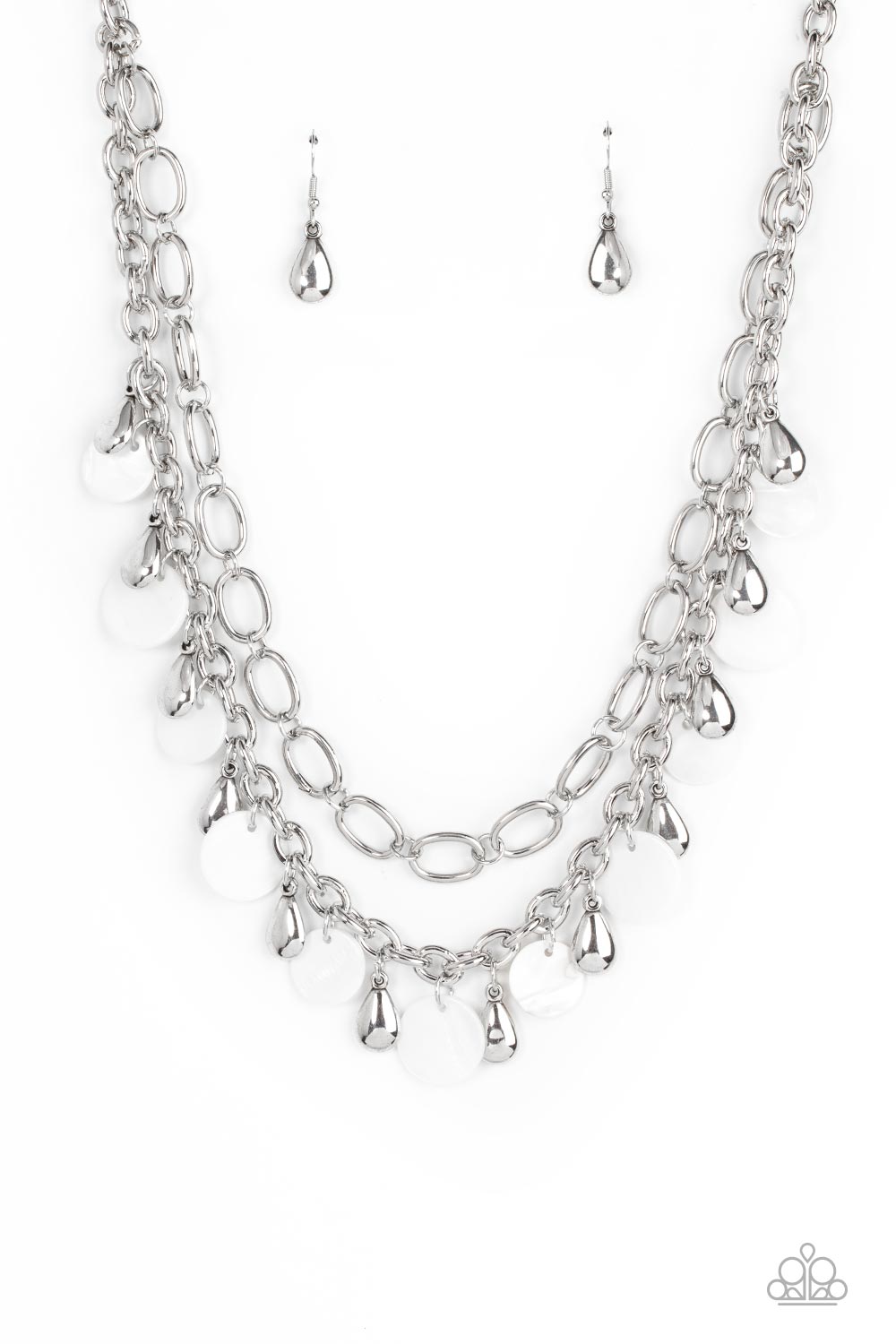 A pair of mismatched chunky silver chains layer below the collar. Shiny silver teardrop beads and white shell-like discs dance from the bottom of the lowermost chain, creating a tropical inspired fringe. Features an adjustable clasp closure.